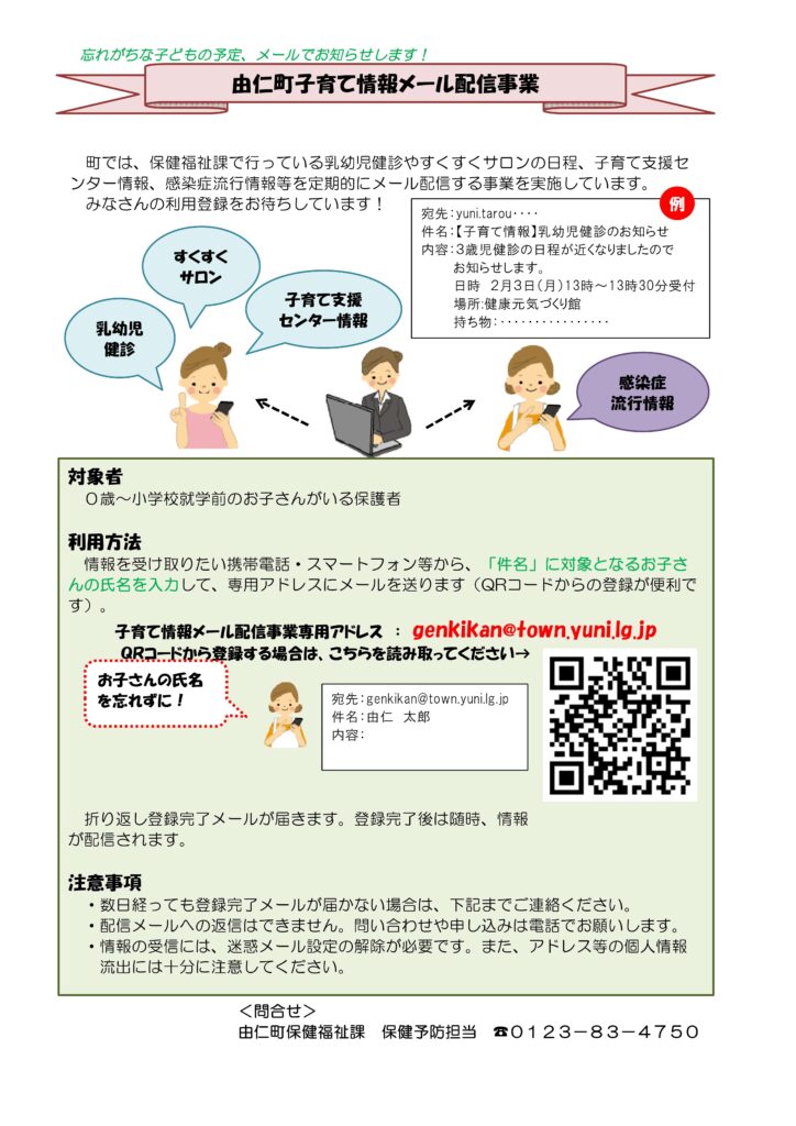 | 利用方法 | スマートフォンまたは携帯電話から、専用アドレス「genkikan@town.yuni.lg.jp」に対象となるお子さんの氏名を入力したメールを送信すると、折り返し登録完了メールが届きます。登録完了後は随時、情報がメールで配信されます。 |
