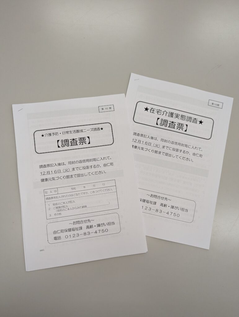由仁町第10期介護保険事業計画の策定にあたり、在宅で生活している65歳以上の方へ11月中旬に調査票を郵送します。介護に関する地域のニーズを計画に反映させるための重要な調査ですので、ご協力願います。
