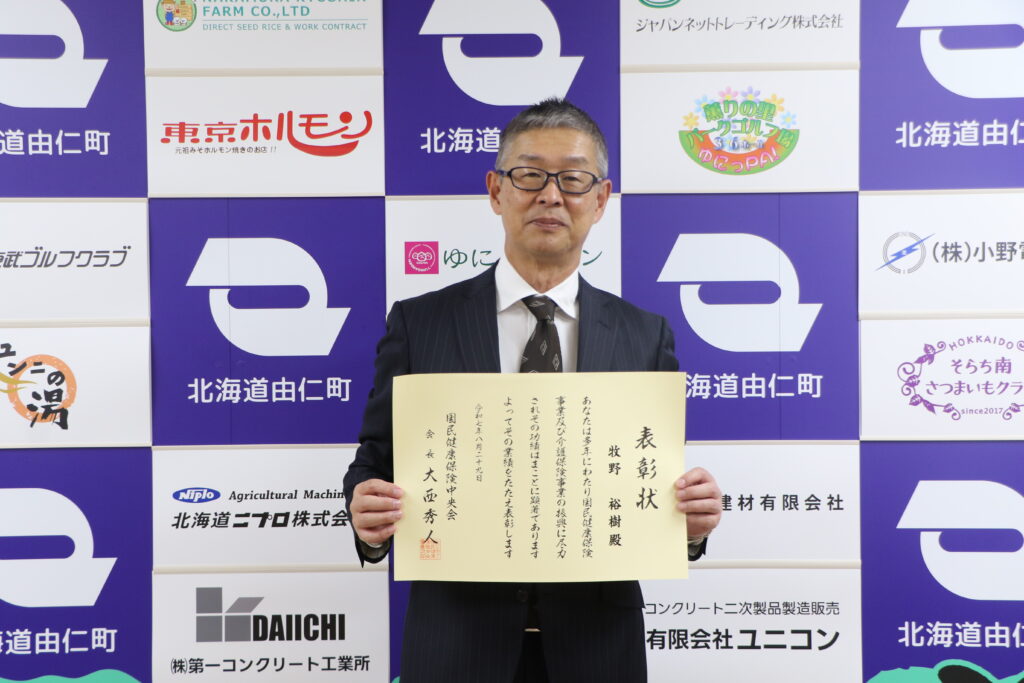 牧野さんは、保険医として日々の診療にあたりながら、平成9年から現在までの長きにわたり、運営協議会委員として由仁町国保の運営に多大な貢献をされているほか、空知南部医師会の会長としての取組など、地域医療の振興発展への寄与が認められ、今回の表彰となりました。