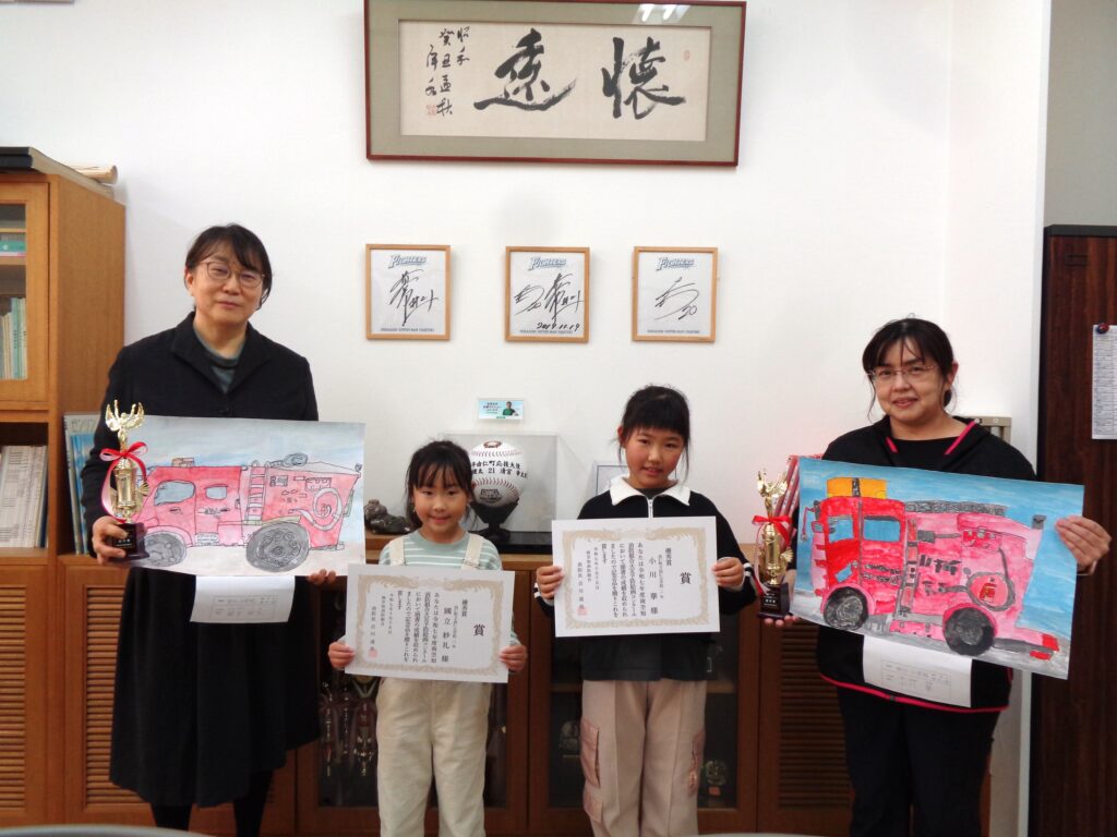 南空知管内の各小学校から40点の応募があり、由仁町からは、小川華(おがわはな)さん(2年)と、國立紗礼(くにたてさら)さん(2年)の作品が優秀賞を受賞し、10月24日、南空知消防組合から表彰状とトロフィーが贈呈されました。