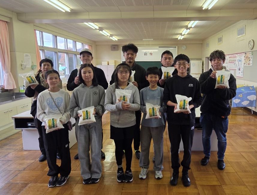 11月21日、そらち南農業協同組合青年部が町内の小・中学校、こども園・保育園を訪れ、今年収穫した新米(1袋1kg入り)を児童生徒・園児全員に寄贈していただきました。