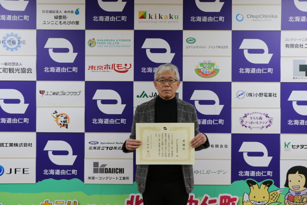 由仁町建設業協会(会長 伊藤正人(いとうまさひと))に健康元気づくり館周辺の平板ブロック補修とポケモンマンホール「ポケふた」設置をしていただきました。この地域貢献活動に対し、12月24日、松村町長から感謝状を贈呈しました。