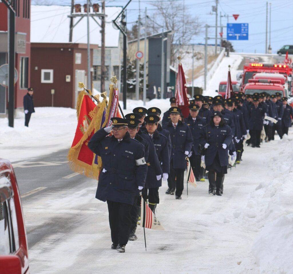 1月7日、令和8年由仁消防団出初式が由仁市街で開催され、総勢92人の消防団員と消防車9台による力強い行進が行われ、整然とした姿が町民に披露されました。