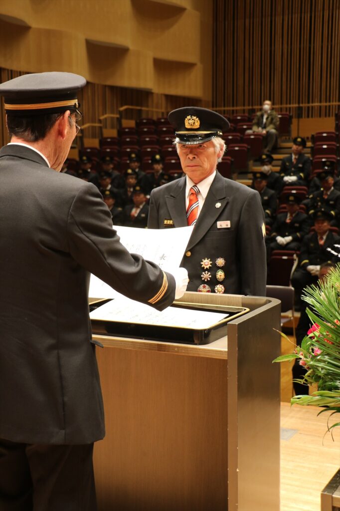 行進の後、文化交流館では各種功労表彰の伝達が行われ、参加した消防団員は防火・防災への意識向上と安全安心のまちづくりへの決意を新たにしました。