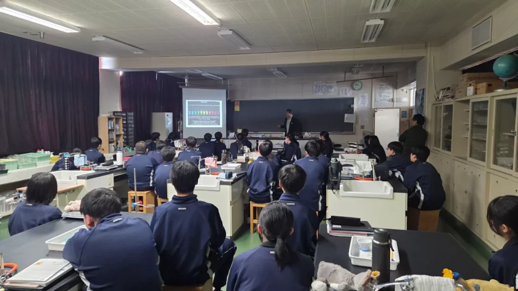 1月26日、山形大学理学部、栗山恭直(くりやまやすなお)教授を招き、由仁中学校の2年生を対象に「オワンクラゲの発光の仕組み」と題し、化学変化と光エネルギーに関する理科実験授業を行いました。